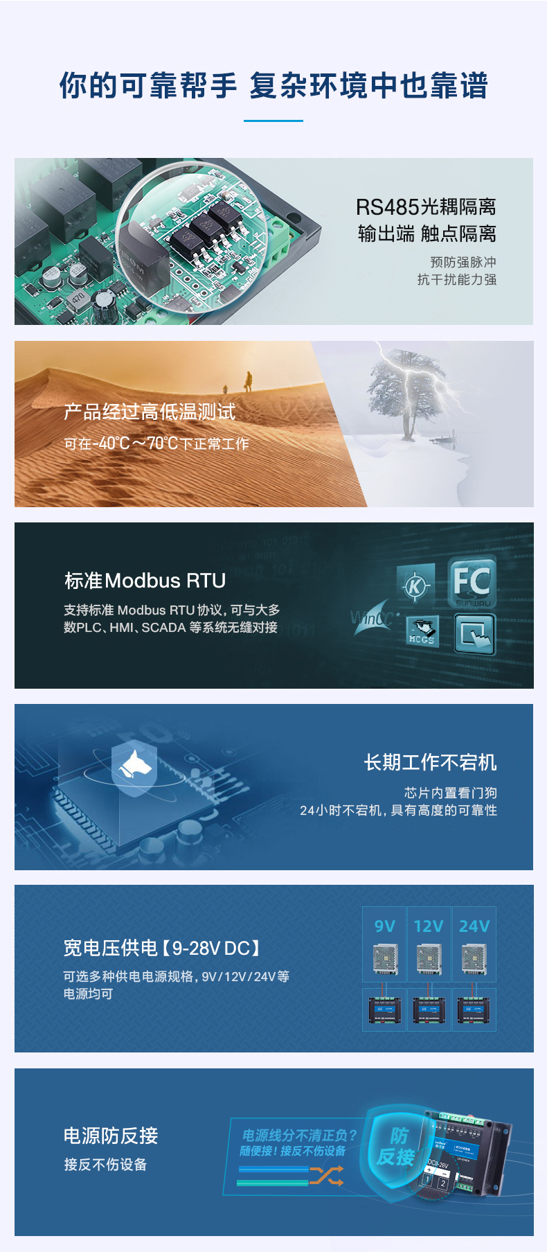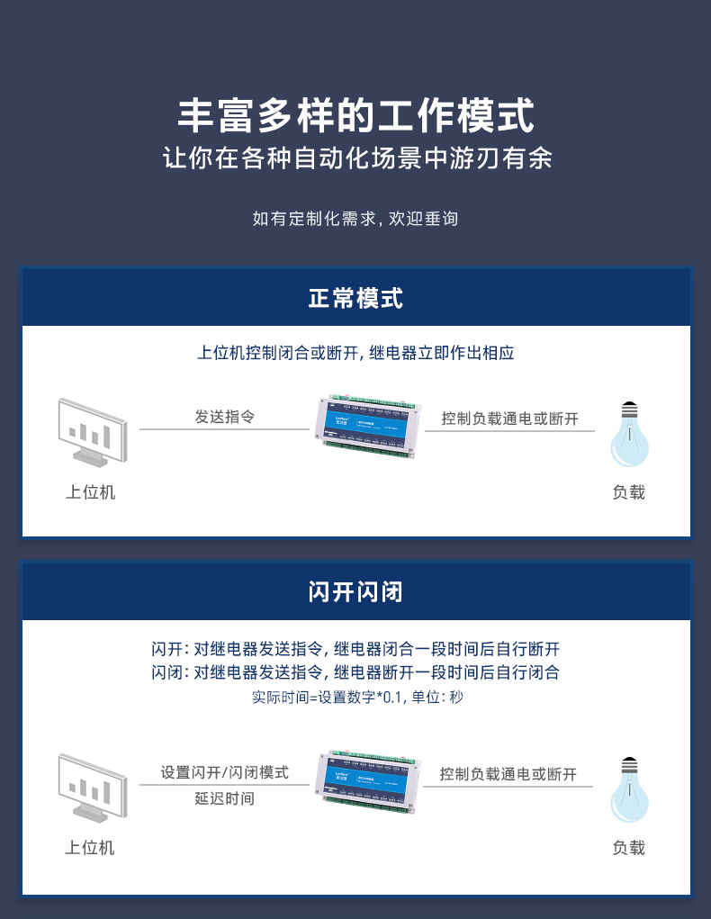 | 工作模式更改;继电器独立控制;继电器整体控制;开关量状态查询;调试信息查询;控制软件;支持各家组态软件;支持 Labview 等 | |||